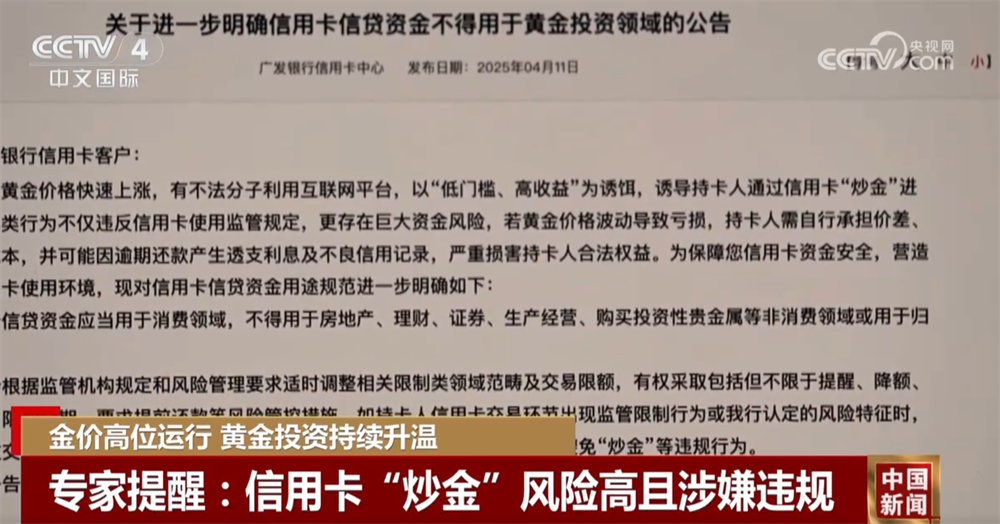 金价高位运行让黄金投资持续升温。记者调查发现,为了追涨黄金,部分投资者萌生了贷款买金、信用卡炒金的想法。本周,金价大幅波动,上海黄金交易所两次发布通知,提示黄金投资风险。今年3月以来,多家银行发出公告警示投资风险,并表示严控信用卡“炒金”。专家提醒,中国对贷款和信用卡资金的用途有明确要求,相关资金不得用于黄金投资等领域。